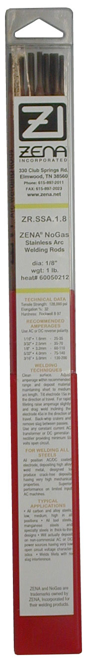 Now you can weld stainless steel anywhere that you can arc weld without the need for an oxyacetylene torch, hoses, regulators, or expensive and heavy gas bottles!These incredibly versatile ZENA® NO-Gas Stainless to Stainless to All Arc Welding Rods let you weld all types of stainless steel creating a super strong 312 Alloy, 128,000 psi weld, highly resistant to cracking or breaking using only your arc welder! Suitable for welding ALL steels. This rod is the absolute ultimate computer engineered, high alloy electrode for welding every known grade of steel using every know stick electrode power source! This is the first truly AC-DC mineral-coated high alloy rod that can be used by anyone regardless of prior welding experience. The key is an arc so ionized that you cannot short it out! Because of the exceptional strength and crack resistance of welds made with these rods, they are ideal for repairing tools, dies, spring steel, and for joining all types of dissimilar metal combinations -- except for Aluminum and Copper alloys. These rods are also recommended for repairing worn parts and an an underlay for hard-facing. You can also use these special stainless steel welding rods for: joining stainless steel to other types of steel (including spring steel), ORjoining all types of dissimilar steels (including spring steel), ORwelding spring steel, ORfor increasing corrosion resistance, ORto produce exceptionally strong, low distortion welds at low welding temperatures.Description: