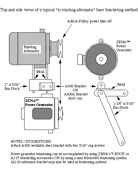 However, if your vehicle is one for which we have developed a custom bracket kit, or if a bolt together bracket kit will work on your vehicle, then installation can be much simpler: For example, a bolt in installation consists of simply relocating engine compartment components (which may be in the way), removing existing bracketing components, and replacing these items with new parts that also accept the ZENA welding power generator. While custom brackets are more expensive than site fabricated components, they may offer a lower cost alternative to a complete installation by a professional mechanic/fabricator. Mechanical installation is simple and straightforward. After insuring that the power generator is fitted with the proper drove pulley for the planned application, brackets (typically user fabricated) are fitted to the engine for mounting the belt driven power generator -- positioning the unit so that a clear path is available for the attachment of the drive belt to the engine flywheel, or other suitable engine power take off point. Thanks to our popular Add-A-Pulley accessory, drive for the generator can also be provided by a pulley attached to the vehicles existing alternator -- a method chosen by more than 80% of installers -- an installation method we call a "piggyback installation". (CLICK HERE to see a piggyback installation diagram and Video) As noted before, occasionally an installation can be accomplished using existing (unused) brackets on a vehicle. However, more typically, simple site fabricated brackets are used. To make this do-it-yourself bracket fabrication easier, universal mounting bracket accessories are available through our parts department and our Online Store. AND, last but not least -- Fully Engineered, Ultra High Quality, Custom Bolt-In Bracket Kits that can be used for mounting our SR200 and SR150 series power generators in addition to the vehicle's existing alternator are also available for a number of popular trucks and vans. Favorite with our industrial and professional customers, these bracket kits are COMPLETE -- including ALL hardware -- nuts, bolts, shims, etc. -- even drive belts are supplied!