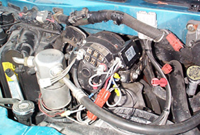 allow for WPG adjustment) mating holes were drilled through the fabricated bracket. A tensioning/support bracket for the WPG was fabricated from a piece of 5/16"x4" plate which was slotted and formed with a plasma torch. This plate was attached to the engine, and a piece of 5/16"x1" bar stock was attached to the engine and formed to provide additional support/stiffness to the plate. In this installation, the ZENA system was installed secondary to the truck's existing alternator and electrical system. An