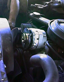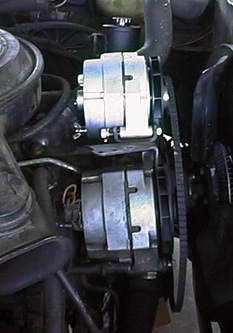 the existing bracket. A piece of 1/4"x1-1/4" bar stock (not shown) is used to lock the WPG into a fixed position which clears obstructions and yet allows sufficient V-belt "wrap" around the WPG and the existing alternator. The existing alternator's belt tensioning system works to properly tension both units.